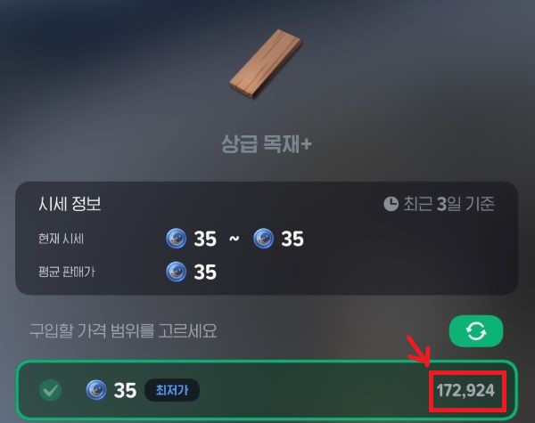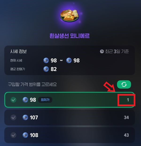사진에서 보시다시피 상급목재+는 172,924개 있는 반면 흰살생선 뫼니에르는 1개밖에 안남아있어요. 이런 경우 1개가 모두 소진되면 자동으로 더 높은 단가에 거래가 가능하겠죠? 그래서 저는 시간날 때 마다 확인하고 되도록이면 매물 2000개 미만인 재고 적은 상품들 위주로 올리고 있답니다!